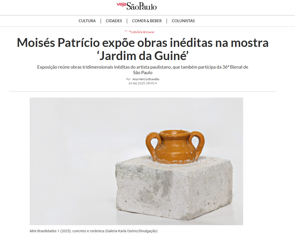 O reconhecimento de “Jardim da Guiné” não para por aí: a mostra também é destaque na VEJA São Paulo, que ressalta o conjunto de obras tridimensionais inéditas de Moisés Patrício, marcando um importante momento de virada em sua trajetória ao deixar de lado a figuração em pintura para aprofundar questões de fé, tradição e a relação entre o orgânico e o concreto, sempre em diálogo com sua participação na 36ª Bienal de São Paulo.